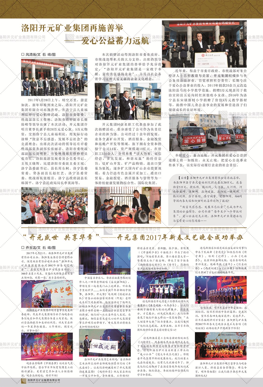洛陽開元礦業(yè)集團有限公司簡介洛陽開元礦業(yè)集團有限公司,始成立于2006年,位于洛陽市開元大道269號。集團旗下共有十余家全資子公司,業(yè)務涉及有色金屬礦山開發(fā)、礦產品購銷與進出口貿易、房地產開發(fā)、文化藝術、企業(yè)管理與咨詢、資本投資等多個領域。2024年,集團公司銷售總額達7.8億元。民建河南省委委員、民建河南省委企業(yè)委副主任、民建洛陽市委委員、企業(yè)委主任、洛陽民建企業(yè)家協(xié)會會長許明月是公司創(chuàng)始人,現(xiàn)任洛陽開元礦業(yè)集團有限公司董事長。在礦業(yè)領域,洛陽開元礦業(yè)集團擁有多家實力雄厚的子公司:貴州開元礦業(yè)有限公司探、采礦權面積共11.33平方公里;興??h銅鑫礦業(yè)有限公司探礦權面積8.76平方公里,礦山資源潛力巨大;2021年,開元集團與盧氏中科礦業(yè)有限公司開展戰(zhàn)略合作。盧氏中科礦業(yè)有限公司專注于有色金屬的浮選、加工和銷售,擁有強大的技術支撐平臺,是集探、采、選、冶、研為一體的中大型綜合礦業(yè)企業(yè)。目前,盧氏中科王家河1000噸選礦廠已成功投產,雙河金礦、柳關欒盧鉛鋅礦相繼順利開工,樓房銀礦與圪老灣鉛鋅礦的深部探礦重大突破,標志著礦山版圖取得重大進展,為開元集團后續(xù)發(fā)展奠定了堅實基礎。在文化傳媒領域,洛陽市明月美術館通過豐富多樣的藝術展覽、學術研討和公共教育活動,努力打造一個集展覽、交流、教育、研究為一體的綜合性藝術平臺。此外,在金融投資領域,開元集團旗下的北京明峰資本管理有限公司專注于投資具有高增長潛力的優(yōu)秀企業(yè),特別是高科技、新能源、環(huán)保等新興產業(yè),為客戶提供個性化的資產配置服務。在做好企業(yè)經營的同時,開元集團始終不忘企業(yè)的社會責任和家國情懷,以突出的愛心公益事跡,開展了一系列公益慈善活動:“民建林”公益事業(yè)通過“思源基金”“幫幫公益”線上公益平臺,與眾多愛心人士籌措資金20余萬元;資助541名貧困大學生共計270余萬元,推進“數(shù)字助力——河南AI人才培養(yǎng)”;捐款10萬元,馳援京津冀、黑龍江洪水地質災害……公司于2017年底被洛陽市慈善總會評為“洛陽慈善風云榜——十大愛心集體”。洛陽開元礦業(yè)集團有限公司秉承持續(xù)發(fā)展理念,憑借多年來良好的企業(yè)信譽與經營業(yè)績,與全國多家企業(yè)建立了良好合作關系,受到社會各界的一致好評,多次榮獲“納稅標兵”“先進企業(yè)”“招商引資模范企業(yè)”等榮譽稱號?;赝麃頃r路,開元人勠力同心,以“闖”的精神和“創(chuàng)”的勁頭,一路披荊斬棘,踏過千山萬水;展望新未來,開元人凝心聚力,不執(zhí)于“舊”,無畏于“新”,秉承“勇于跨越,追求卓越”的企業(yè)精神,乘著國家高質量發(fā)展新征程的東風,跨過高山,越過大海,向著集團多元化、國際化的目標,逐夢遠航,跨越前行!