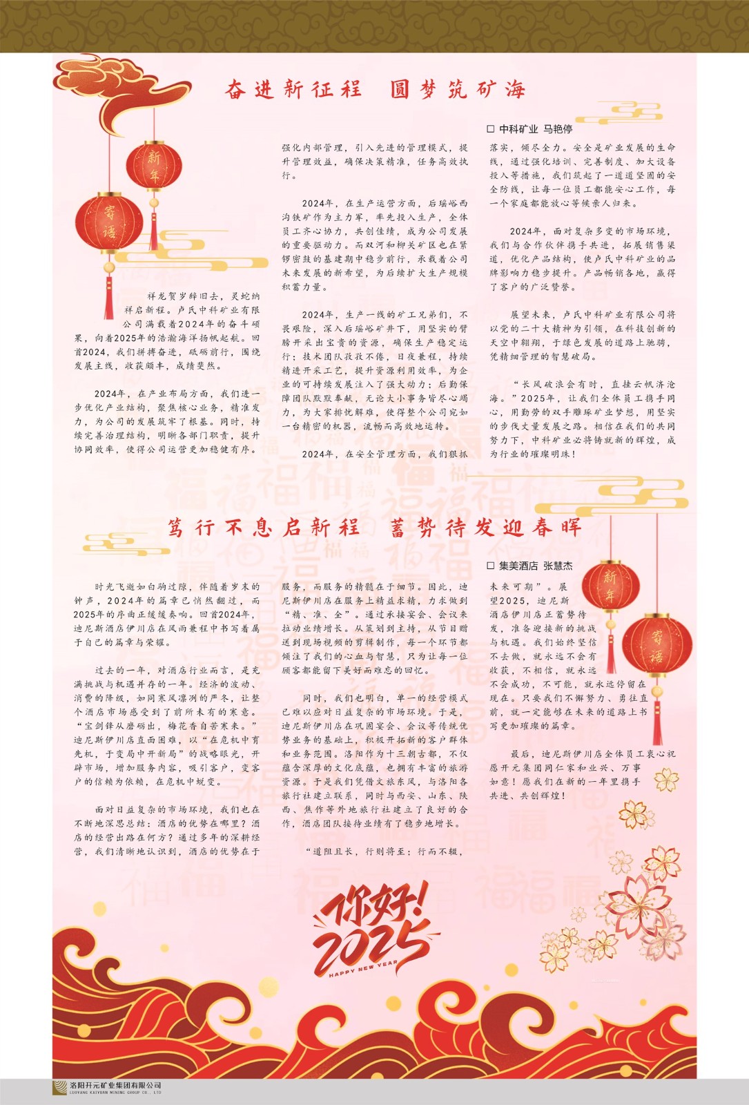 洛陽開元礦業(yè)集團(tuán)有限公司簡(jiǎn)介洛陽開元礦業(yè)集團(tuán)有限公司,始成立于2006年,位于洛陽市開元大道269號(hào)。集團(tuán)旗下共有十余家全資子公司,業(yè)務(wù)涉及有色金屬礦山開發(fā)、礦產(chǎn)品購銷與進(jìn)出口貿(mào)易、房地產(chǎn)開發(fā)、文化藝術(shù)、企業(yè)管理與咨詢、資本投資等多個(gè)領(lǐng)域。2024年,集團(tuán)公司銷售總額達(dá)7.8億元。民建河南省委委員、民建河南省委企業(yè)委副主任、民建洛陽市委委員、企業(yè)委主任、洛陽民建企業(yè)家協(xié)會(huì)會(huì)長(zhǎng)許明月是公司創(chuàng)始人,現(xiàn)任洛陽開元礦業(yè)集團(tuán)有限公司董事長(zhǎng)。在礦業(yè)領(lǐng)域,洛陽開元礦業(yè)集團(tuán)擁有多家實(shí)力雄厚的子公司:貴州開元礦業(yè)有限公司探、采礦權(quán)面積共11.33平方公里;興??h銅鑫礦業(yè)有限公司探礦權(quán)面積8.76平方公里,礦山資源潛力巨大;2021年,開元集團(tuán)與盧氏中科礦業(yè)有限公司開展戰(zhàn)略合作。盧氏中科礦業(yè)有限公司專注于有色金屬的浮選、加工和銷售,擁有強(qiáng)大的技術(shù)支撐平臺(tái),是集探、采、選、冶、研為一體的中大型綜合礦業(yè)企業(yè)。目前,盧氏中科王家河1000噸選礦廠已成功投產(chǎn),雙河金礦、柳關(guān)欒盧鉛鋅礦相繼順利開工,樓房銀礦與圪老灣鉛鋅礦的深部探礦重大突破,標(biāo)志著礦山版圖取得重大進(jìn)展,為開元集團(tuán)后續(xù)發(fā)展奠定了堅(jiān)實(shí)基礎(chǔ)。在文化傳媒領(lǐng)域,洛陽市明月美術(shù)館通過豐富多樣的藝術(shù)展覽、學(xué)術(shù)研討和公共教育活動(dòng),努力打造一個(gè)集展覽、交流、教育、研究為一體的綜合性藝術(shù)平臺(tái)。此外,在金融投資領(lǐng)域,開元集團(tuán)旗下的北京明峰資本管理有限公司專注于投資具有高增長(zhǎng)潛力的優(yōu)秀企業(yè),特別是高科技、新能源、環(huán)保等新興產(chǎn)業(yè),為客戶提供個(gè)性化的資產(chǎn)配置服務(wù)。在做好企業(yè)經(jīng)營(yíng)的同時(shí),開元集團(tuán)始終不忘企業(yè)的社會(huì)責(zé)任和家國(guó)情懷,以突出的愛心公益事跡,開展了一系列公益慈善活動(dòng):“民建林”公益事業(yè)通過“思源基金”“幫幫公益”線上公益平臺(tái),與眾多愛心人士籌措資金20余萬元;資助541名貧困大學(xué)生共計(jì)270余萬元,推進(jìn)“數(shù)字助力——河南AI人才培養(yǎng)”;捐款10萬元,馳援京津冀、黑龍江洪水地質(zhì)災(zāi)害……公司于2017年底被洛陽市慈善總會(huì)評(píng)為“洛陽慈善風(fēng)云榜——十大愛心集體”。洛陽開元礦業(yè)集團(tuán)有限公司秉承持續(xù)發(fā)展理念,憑借多年來良好的企業(yè)信譽(yù)與經(jīng)營(yíng)業(yè)績(jī),與全國(guó)多家企業(yè)建立了良好合作關(guān)系,受到社會(huì)各界的一致好評(píng),多次榮獲“納稅標(biāo)兵”“先進(jìn)企業(yè)”“招商引資模范企業(yè)”等榮譽(yù)稱號(hào)?;赝麃頃r(shí)路,開元人勠力同心,以“闖”的精神和“創(chuàng)”的勁頭,一路披荊斬棘,踏過千山萬水;展望新未來,開元人凝心聚力,不執(zhí)于“舊”,無畏于“新”,秉承“勇于跨越,追求卓越”的企業(yè)精神,乘著國(guó)家高質(zhì)量發(fā)展新征程的東風(fēng),跨過高山,越過大海,向著集團(tuán)多元化、國(guó)際化的目標(biāo),逐夢(mèng)遠(yuǎn)航,跨越前行!